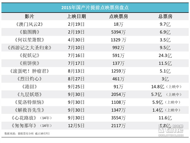 回看中国电影市场,影片点映竞争有愈演愈烈的架势,各路神仙针锋相对、各出奇招。盘点今年上映的影片中,做过“提前点映”的不在少数,点映票房在一千万左右的有:《何以笙箫默》、《西游记之大圣归来》、《滚蛋吧!肿瘤君》、《夏洛特烦恼》和《解救吾先生》。不过,再看看这些电影的最终票房,差别同样不小。谁是“虚张声势”,谁是真正受到观众追捧,要等到影片上映后才能见分晓。